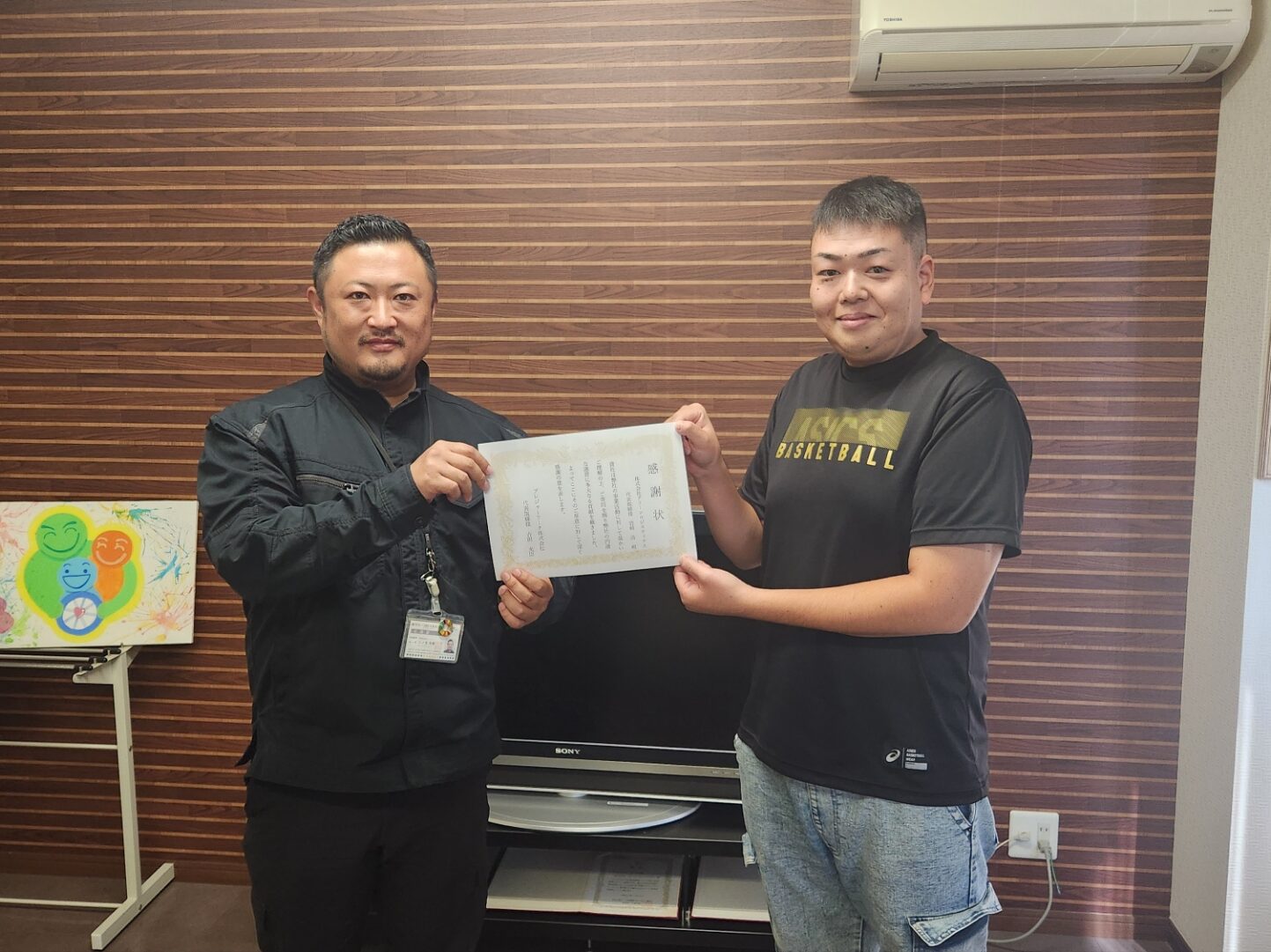 事務所棟の階段に展示している絵のリースをはじめ、環境レポートの表紙のデザイン等でお世話になっているプレジャーワーク様に毎年寄付をして、就労支援が必要な方々の働く機会を創る手助けを微力ながらしています。そのプレジャーワークの吉田社長と利用者様から感謝状と利用者様が生産された椎茸ときくらげをいただきました!