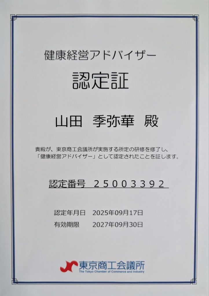 健康経営経営の取り組みの一環として、健康経営アドバイザーを取得致しました。