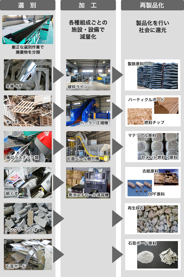 選別された廃棄物は、各組成に対応した弊社及び提携施設にて加工されます。