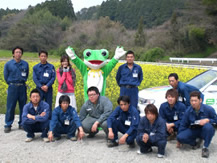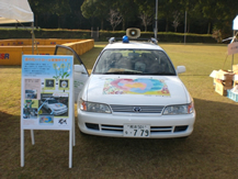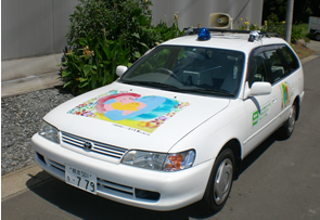 護川小学校区周辺を、BDF(バイオディーゼル燃料)を使用したエコカーで防犯パトロールを行っています。(イメージキャラクターのリサイケロくん)